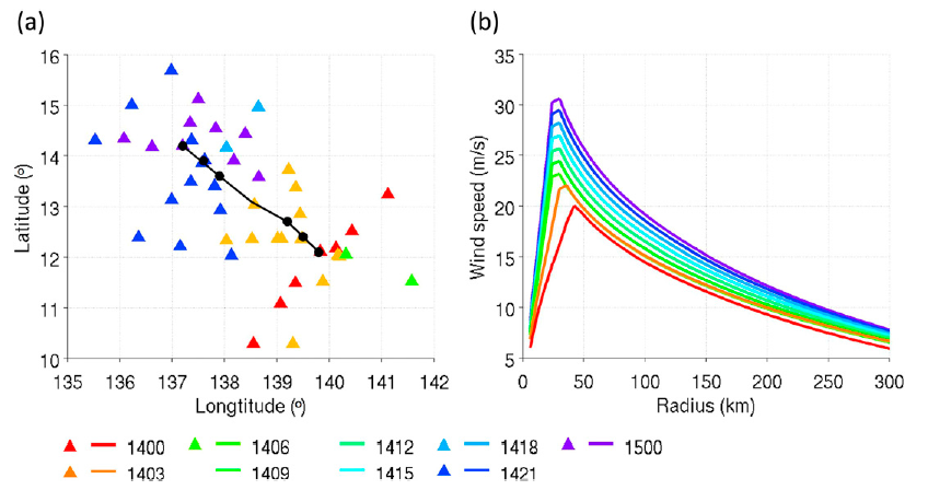 圖一、兩種觀測分布圖。(a)投落送。(b)軸對稱風場。顏色表示時間(DDHH)。