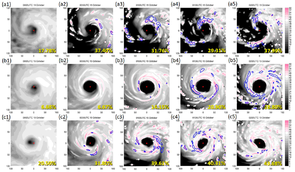 圖四、(a)DP、(b)VT、(c)BOTH實驗預報期間之三公里回波(顏色)與積雲對流爆發(藍線區域),左下角黃色數值表示波數大於五之總擾動能量占比。