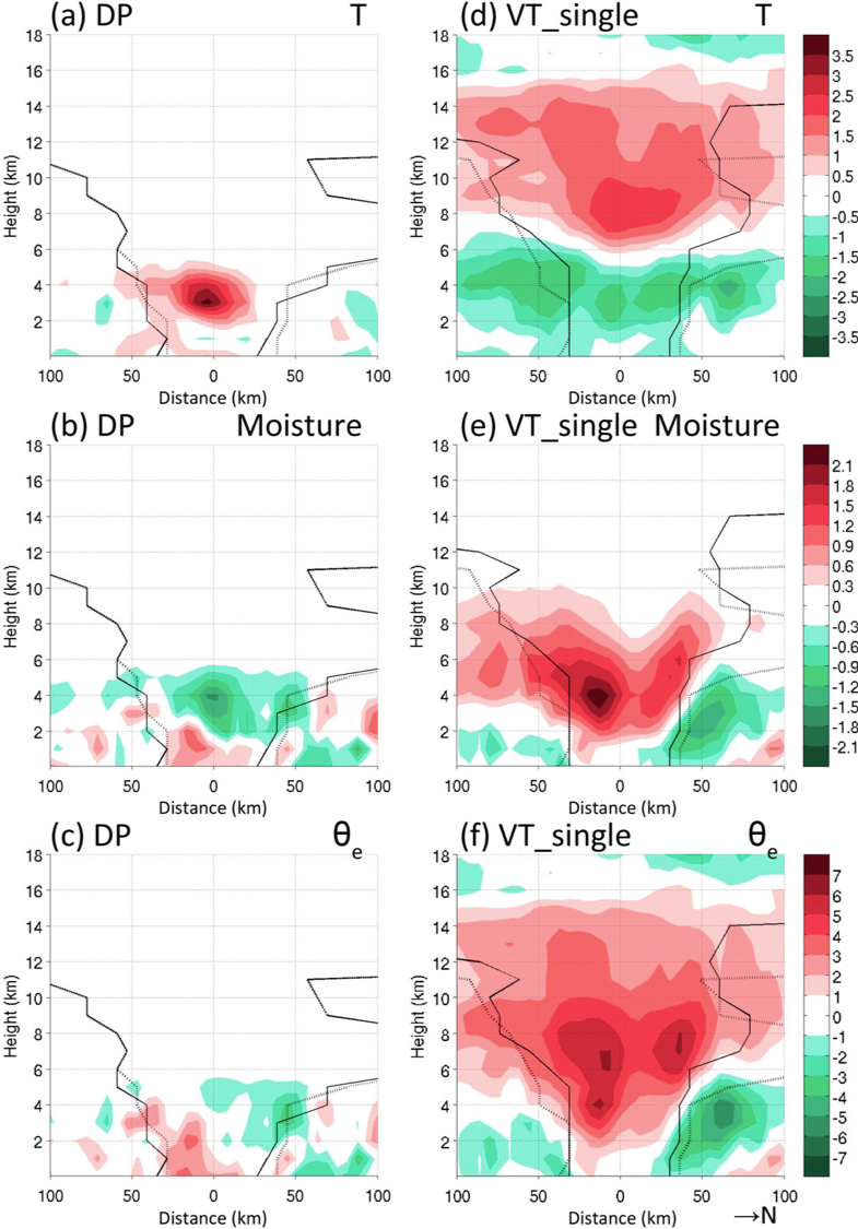 圖三、15日00時分析增量的南北剖面。(a)、(b)、(c)分別為DP實驗的溫度、水氣、相當位溫增量。(d)、(e)、(f)同(a)、(b)、(c),但為VT實驗。
