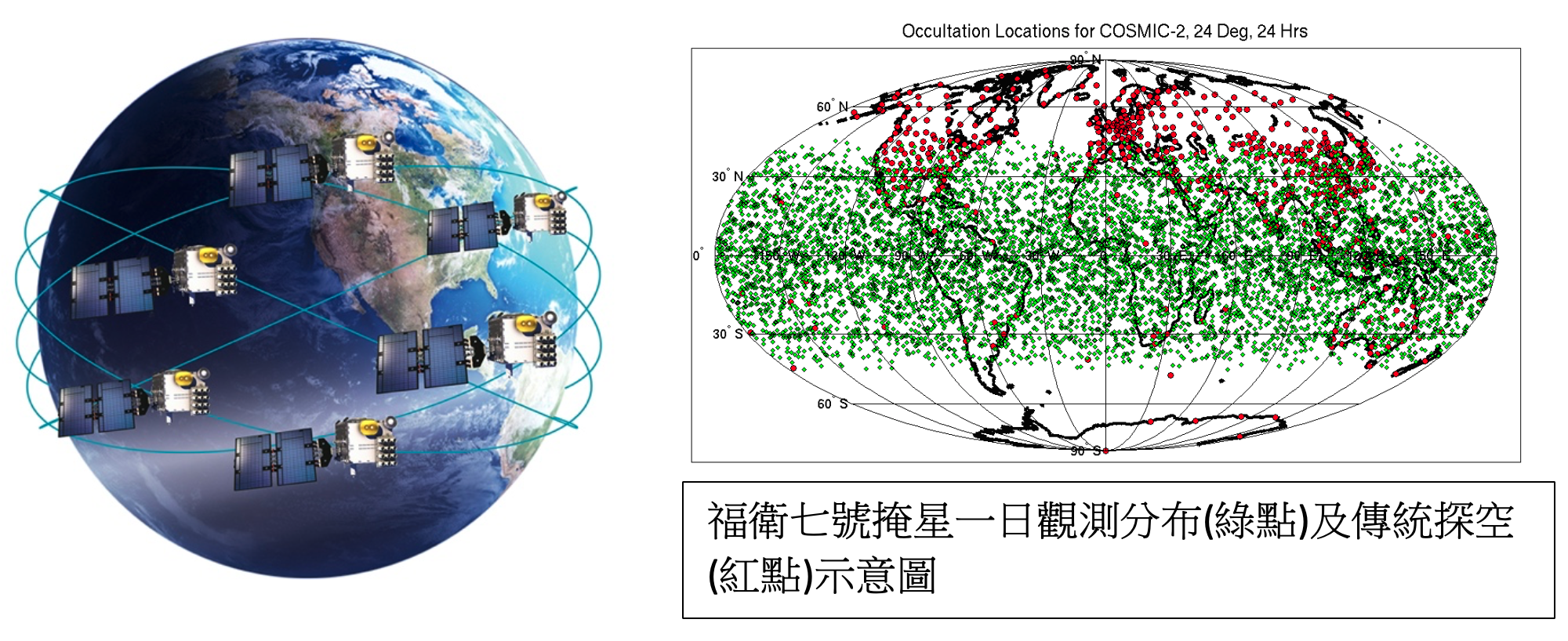 福爾摩沙衛星七號(FORMOSAT-7)已於2019年6月底成功發射,接續即將除役的福爾摩沙衛星三號(FORMOSAT-3),目前每日可提供多達5000筆全球南北緯45度以內的高解析度大氣掩星觀測資料,可用以彌補全球海洋、高山及極地地區所缺乏的觀測資料,且不受天候及時間之影響。而新一代福衛資料集中於熱帶至副熱帶區域,有利於觀測熱帶對流及颱風生成及發展。掩星觀測之偏折角或折射率可直接同化於大氣模式,增進模式初始場的準確度,並可反演出垂直溫、溼度剖面,大量補足傳統觀測的時空之不足,對於全球及區域大氣分析帶來明顯的助益。因此,掩星觀測可視為大氣上層最佳溫度計,低層輔助濕度計。