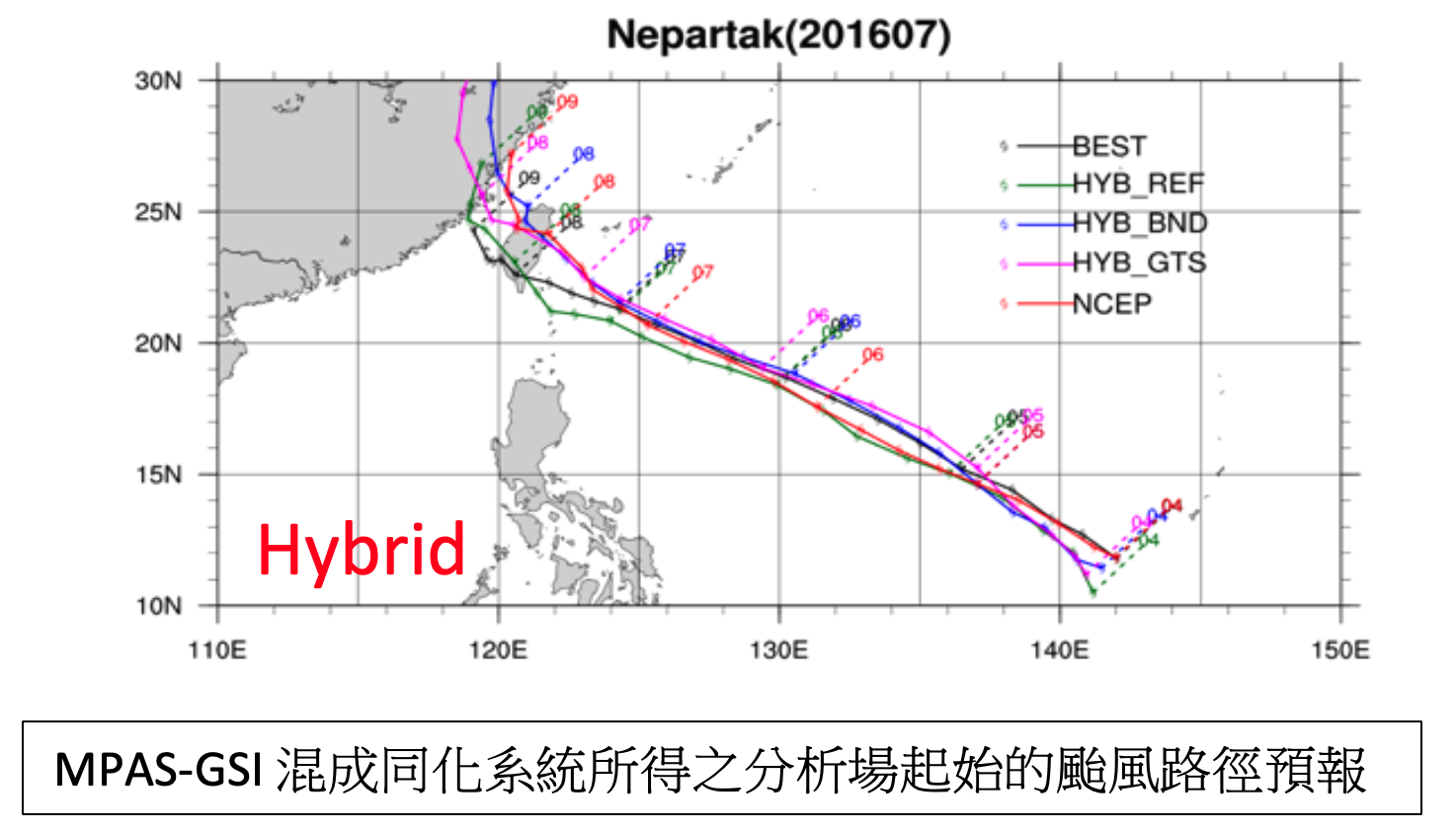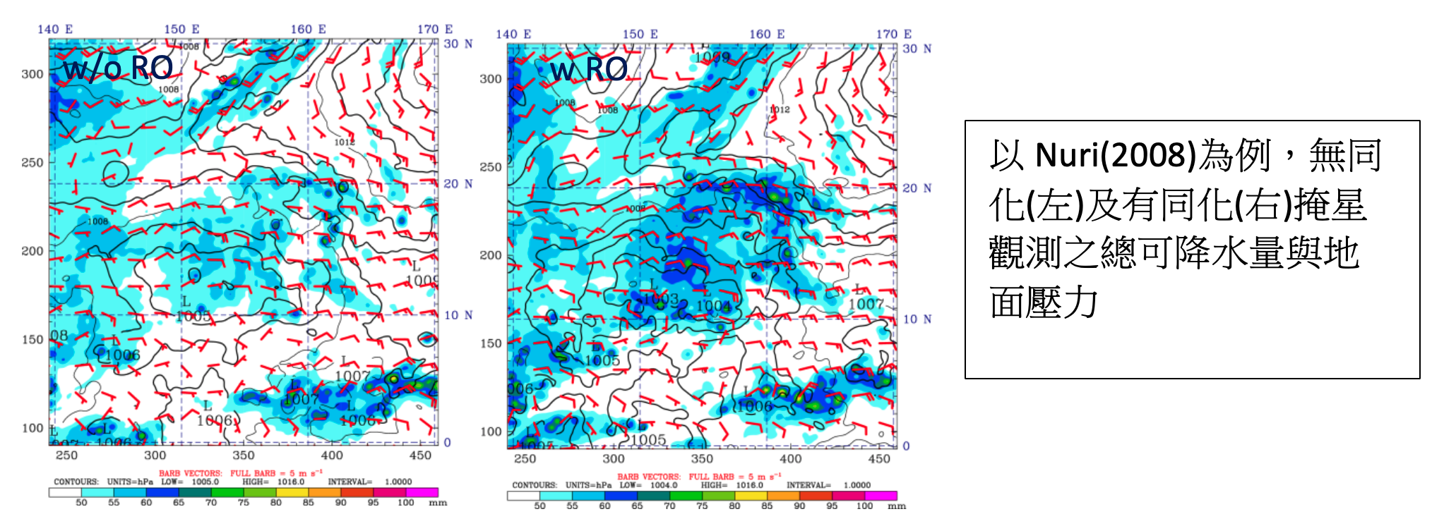 同化掩星觀測資料亦有助於改善颱風路徑預報。例如近期黃清勇教授指導的碩士生施正澎的研究論文(施,2019)利用雙向MPAS-GSI系統模擬2016年尼伯特颱風發現掩星資料同化可有效改善路徑及降雨模擬。