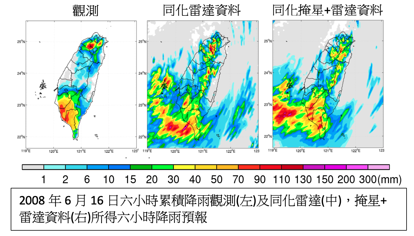 此外,Huang et al. (2016)以台灣北部鋒面降雨進行模擬研究。相較於局地折射率及非局地折射率,同化局地偏折角可以產生更明顯的降雨,提高劇烈降雨預報能力。