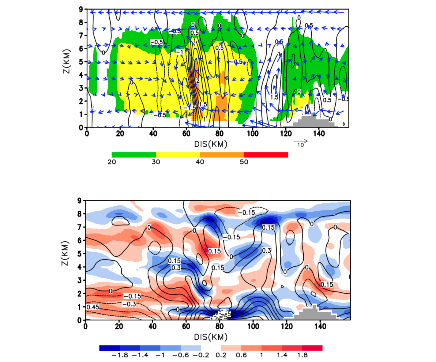圖三、使用廖宇慶老師所發展的反演法,解析出天氣系統內的三維運動及熱力場,圖為針對一登陸階段的颮線系統,利用雷達資料所求出來的沿地表和山脈的(上圖):風場(箭頭)及垂直速度場(等值線),其中觀測的雷達回波以色階表示; (下圖)氣壓擾動場(等值線)及位溫擾動場(色階)。摘自 Liou et al. (2019, MWR) 。