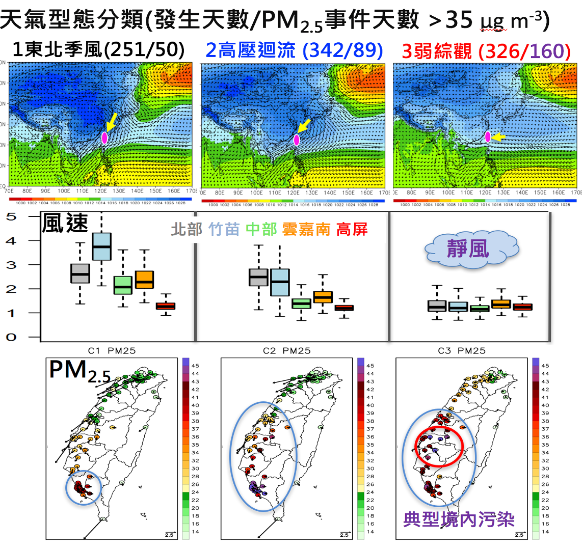 圖一、臺灣秋冬空污季節常見天氣型態(上),以及各天氣型態下,臺灣西半部各空品區風速(中)與PM2.5濃度分佈。
