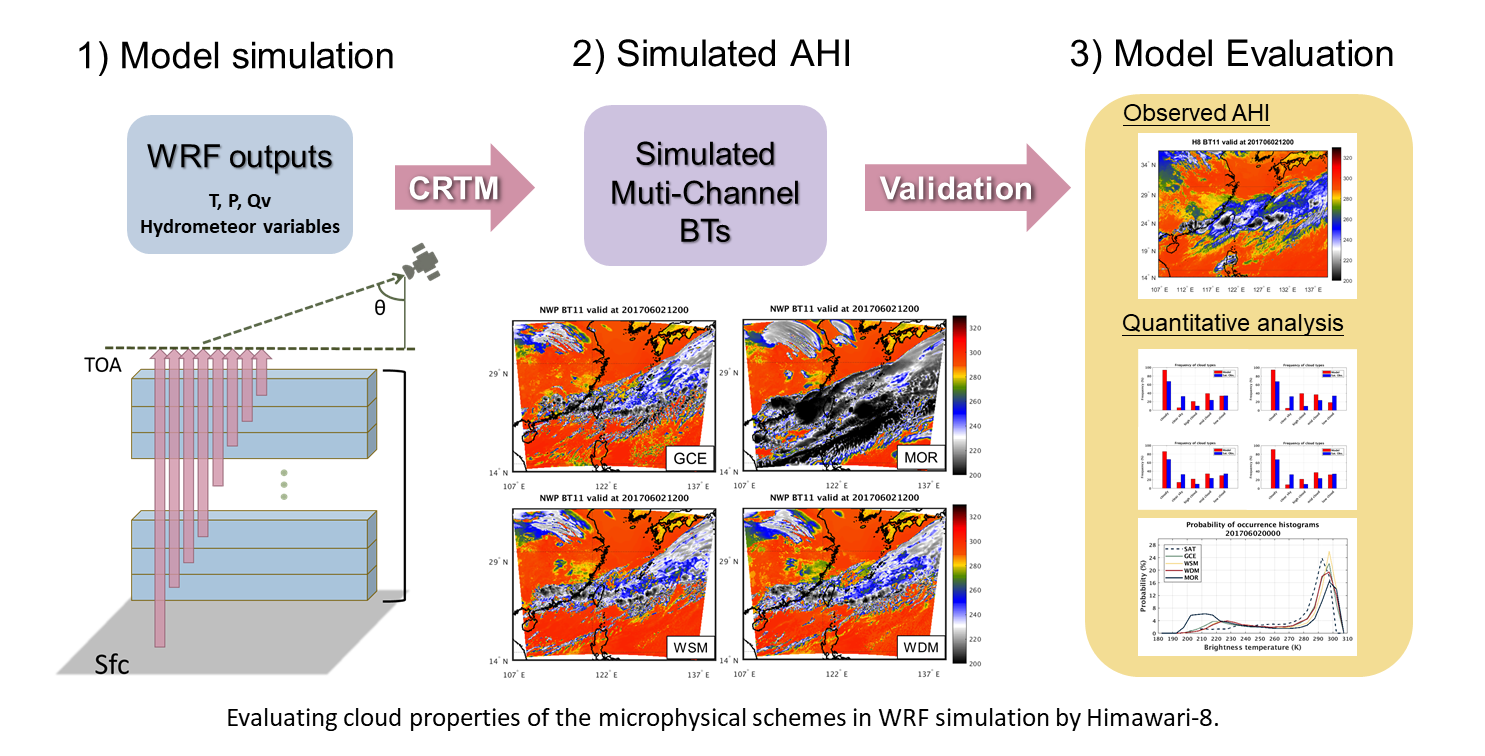 本研究使用CRTM (Community Radiative Transfer Model)來連結由數值模式所輸出的變數與衛星觀測做驗證。研究著重於利用多頻道的地球同步衛星影像-日本向日葵八號衛星來客觀檢驗區域模式-WRF (Weather Research and Forecasting)在使用不同微物理參數化法(GCE, WSM, WDM, MOR)的模擬表現。選取2017年6月1日造成臺灣強降雨事件的梅雨天氣型態為本研究的模擬個案來校驗數值模式在低雲、中雲、高雲、以及水氣分布上的表現。此外,亦藉由敏感度測試調整冷雲的厚度,了解數雲微物理方案可以如何修正與改善,進而改善數值天氣預報之表現。