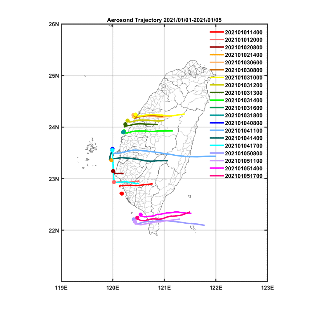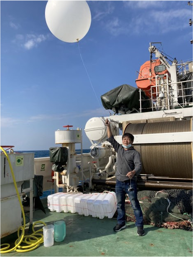 王聖翔老師實驗室自主研發的低層大氣探空儀,搭載氣象及PM2.5感測器,首次於2021年1月1日到6日參加國研院海研三號的科學任務,海研船從高雄旗津出發一路上沿海岸線抵達中部外海再返航,這趟航程團隊共施放了20顆探空氣球,氣球垂直高度最高達12km,水平傳送距離最遠達200km,此次的資料將進一步與鄭芳怡、楊舒芝老師實驗室合作,用於了解海洋大氣邊界層的特性及空氣品質狀況。