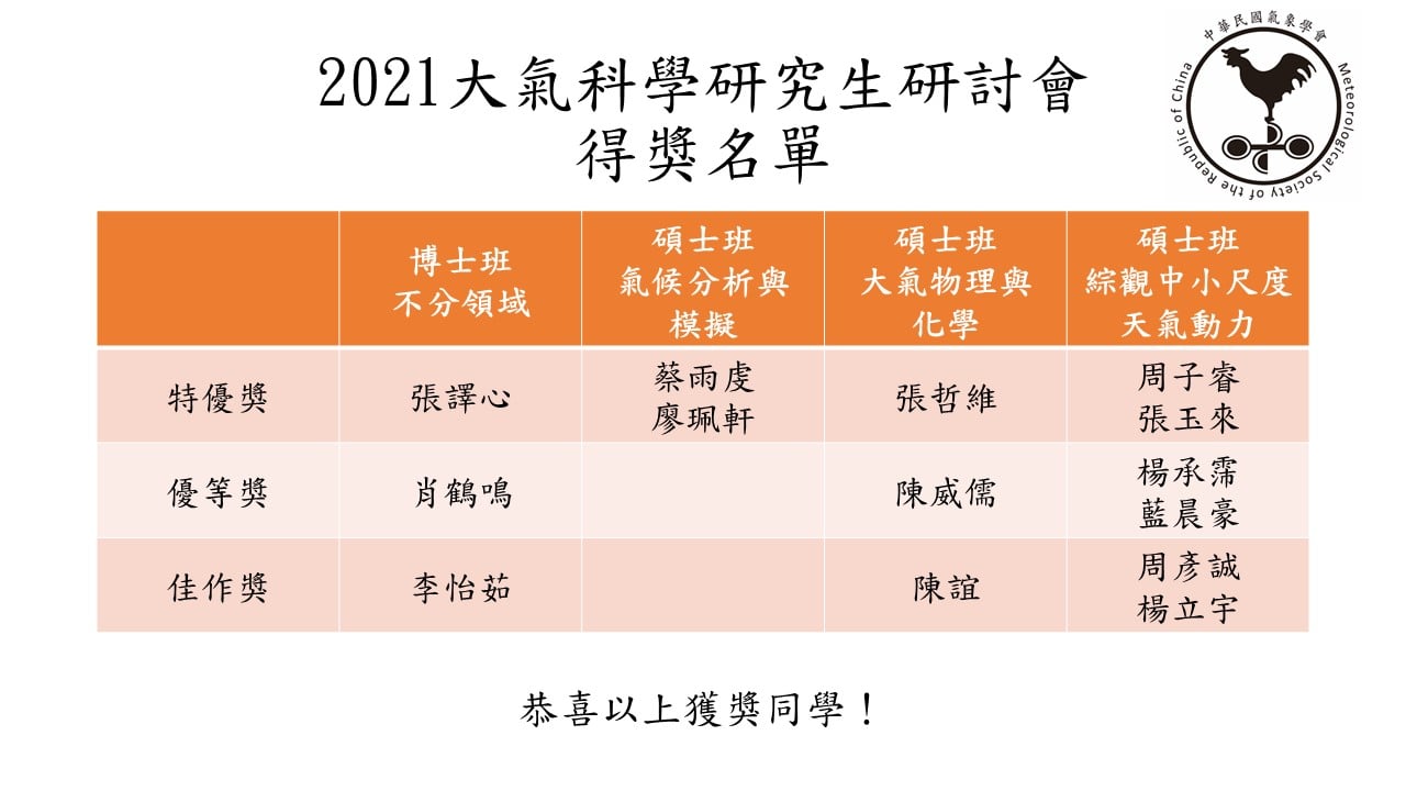 博士班:李怡茹佳作 碩士班-氣候分析與模擬組:蔡雨虔-特優 碩士班-大氣物理與化學組:張哲維—特優, 陳威儒—優等獎, 陳誼—佳作 碩士班-綜觀中小尺度天氣動力組:周子睿—特優, 楊承霈、藍晨豪—優等獎, 周彥誠—佳作