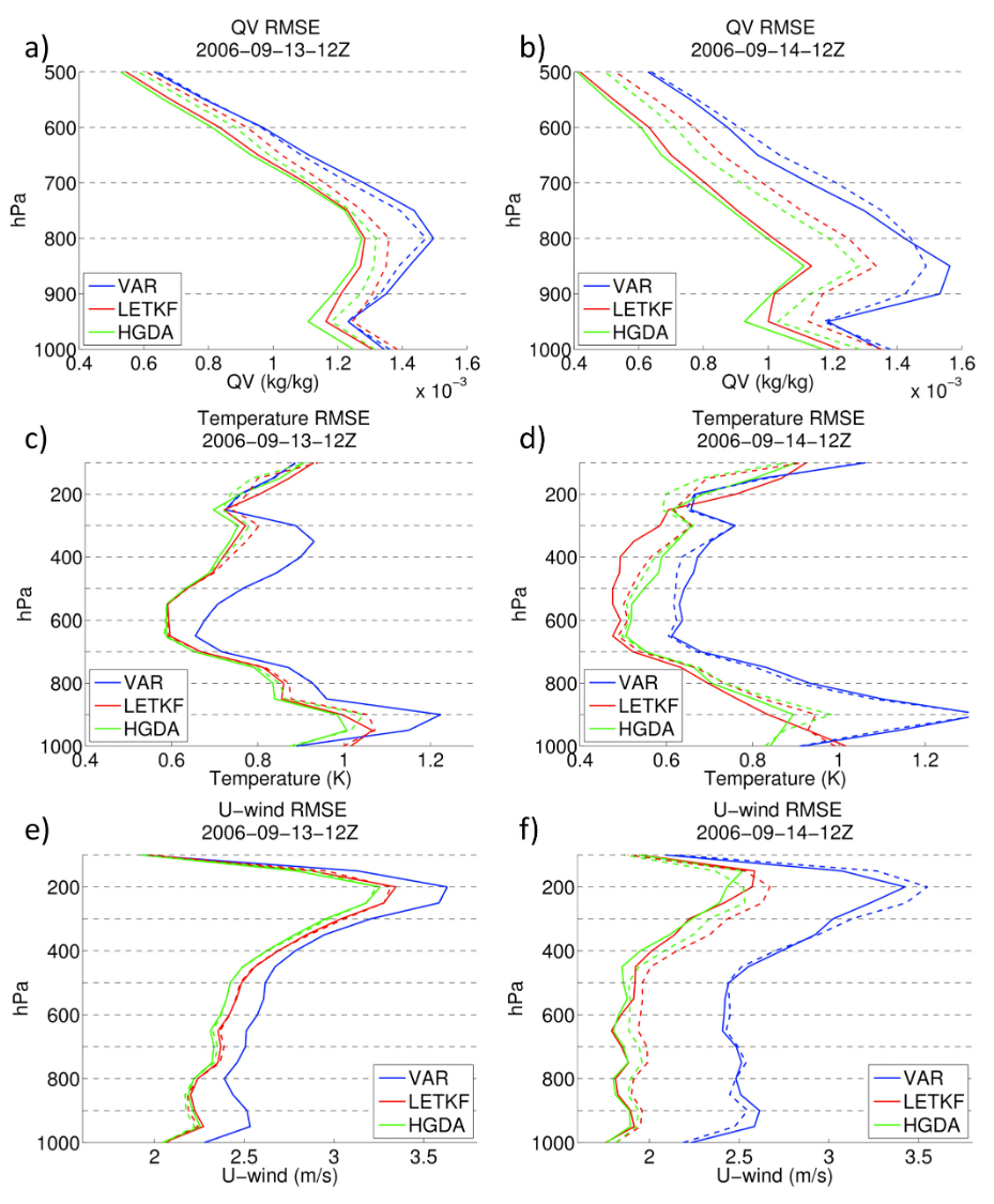研究結果顯示(下圖),WRF-HGDA同化系統的表現優於WRF-LETKF以及WRF-3DVAR同化系統,尤其是WRF-HGDA透過WRF-3DVAR所提供的誤差修正,可有效地改善WRF-LETKF因大氣低層離散度不足的問題而產生修正受限的問題。整體而言,福衛七號所提供的掩星觀測資料在WRF-HGDA系統中有更佳的同化效益,具有最小的低層溫濕度分析誤差,此結果也代表使用更進階的同化方法同化掩星觀測能建立更可靠的低層熱力場。惟在900-300hPa的溫度場,因WRF-3DVAR提供的修正資訊較不理想,連帶影響WRF-HGDA的同化表現。後續可透過調整WRF-HGDA使用的結合權重提升WRF-HGDA同化系統於中高層溫度場的表現。