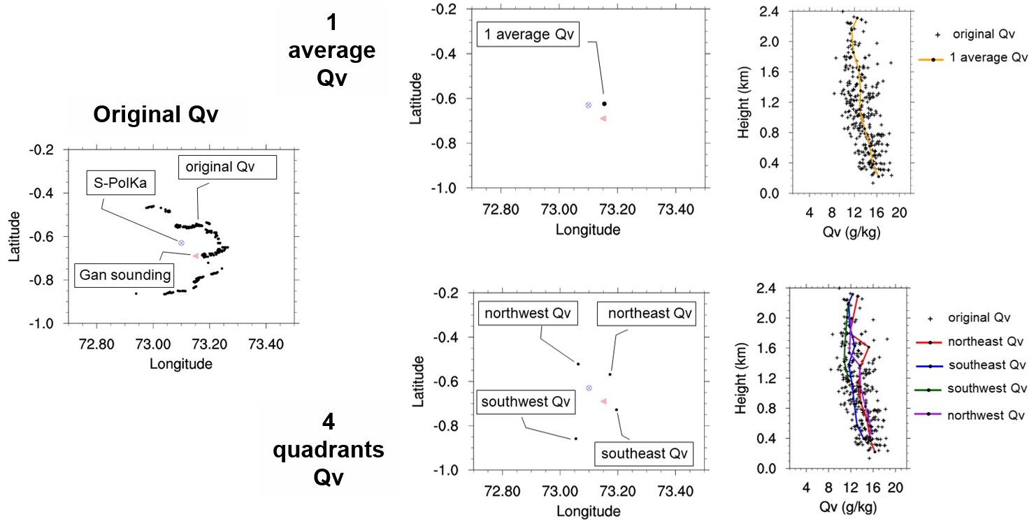 圖2. 反演水氣資訊在空間上之原始分布(Original Qv,左圖)。同化時將反演水氣在整個空間上平均成一點(1 average Qv,中上圖),以及分成四個不同方位後平均(4 quadrants Qv,中下圖) 所得之垂直剖面水氣資訊(最右兩張圖)。