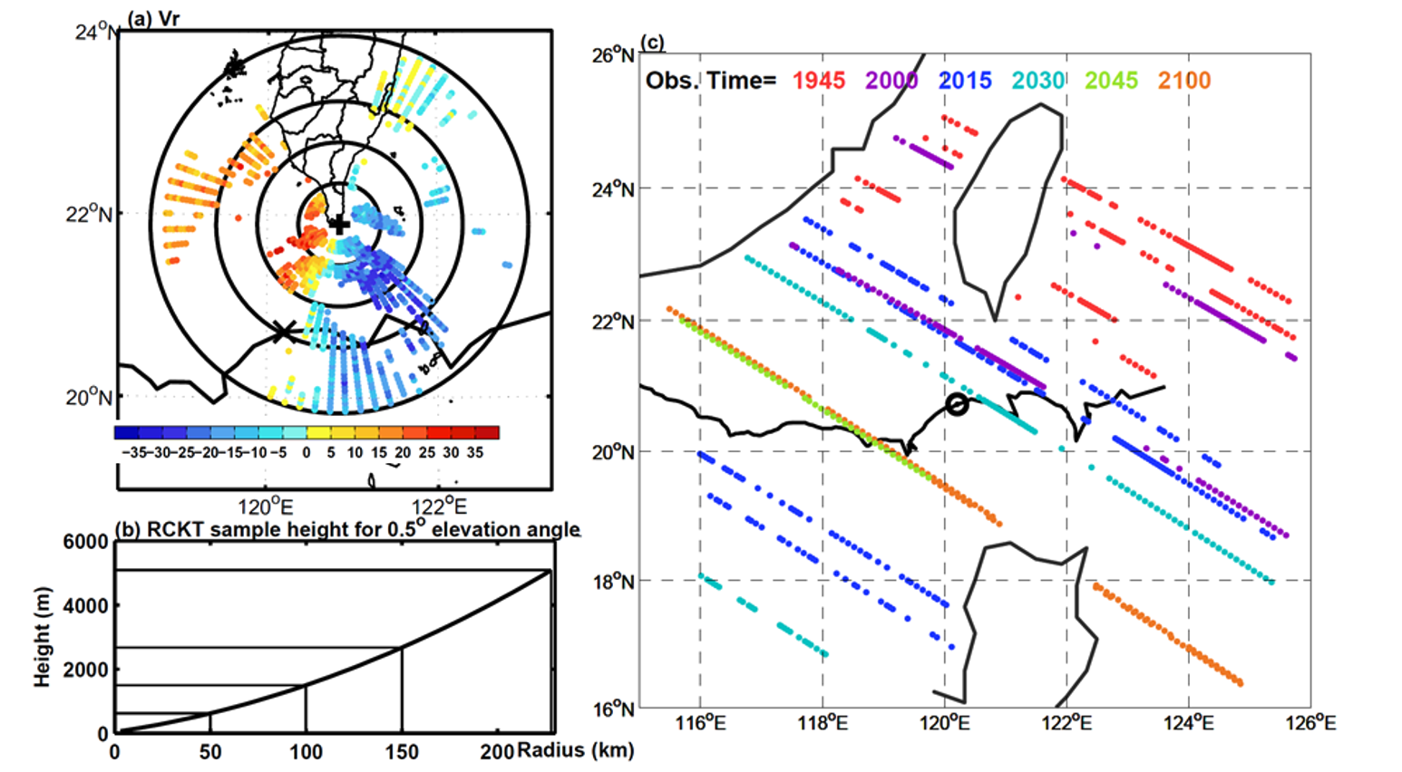 圖一.(a) 2017年8月21日2100 UTC時的雷達徑向風觀測。(b)雷達以0.5度仰角進行觀測時,觀測高度隨水平距離的變化。(c)OSSE實驗中同化之GNSS-R風速觀測位置。