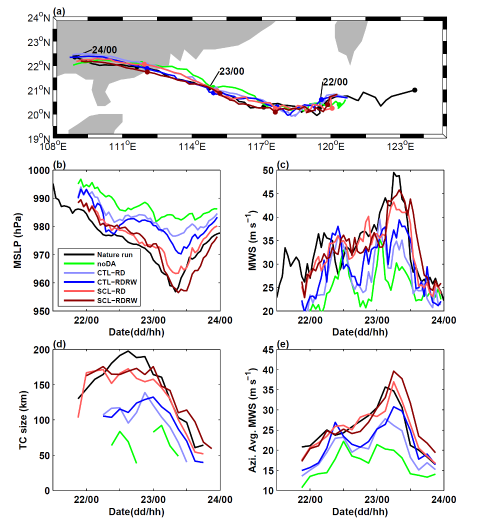 圖二.以2017年8月21日2100 UTC之分析場為初始條件進行兩天預報之結果。(a)-(e)分別為颱風路徑、中心氣壓、海表面最大風速、34海浬風速半徑與軸對稱最大風速。