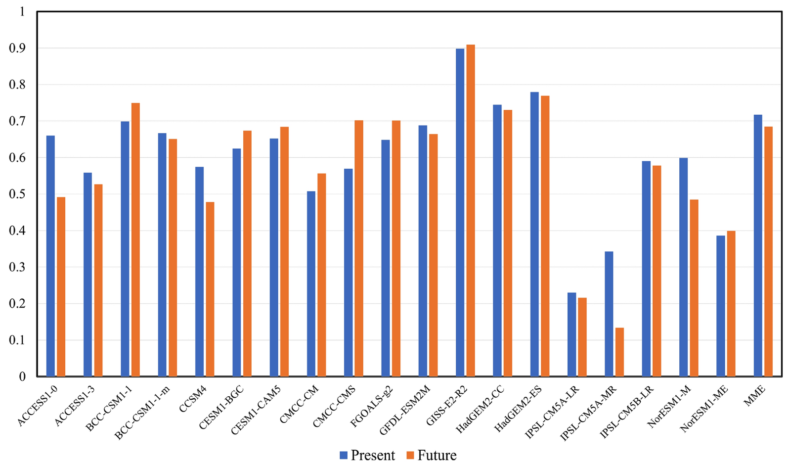 圖一、19個CMIP5模式中,赤道湧升流年循環在原始輸出值與理論模擬值之間的相關係數,藍色與橘色長條分別為現階段(1976–2005)與未來推估(2071–2100)的結果。