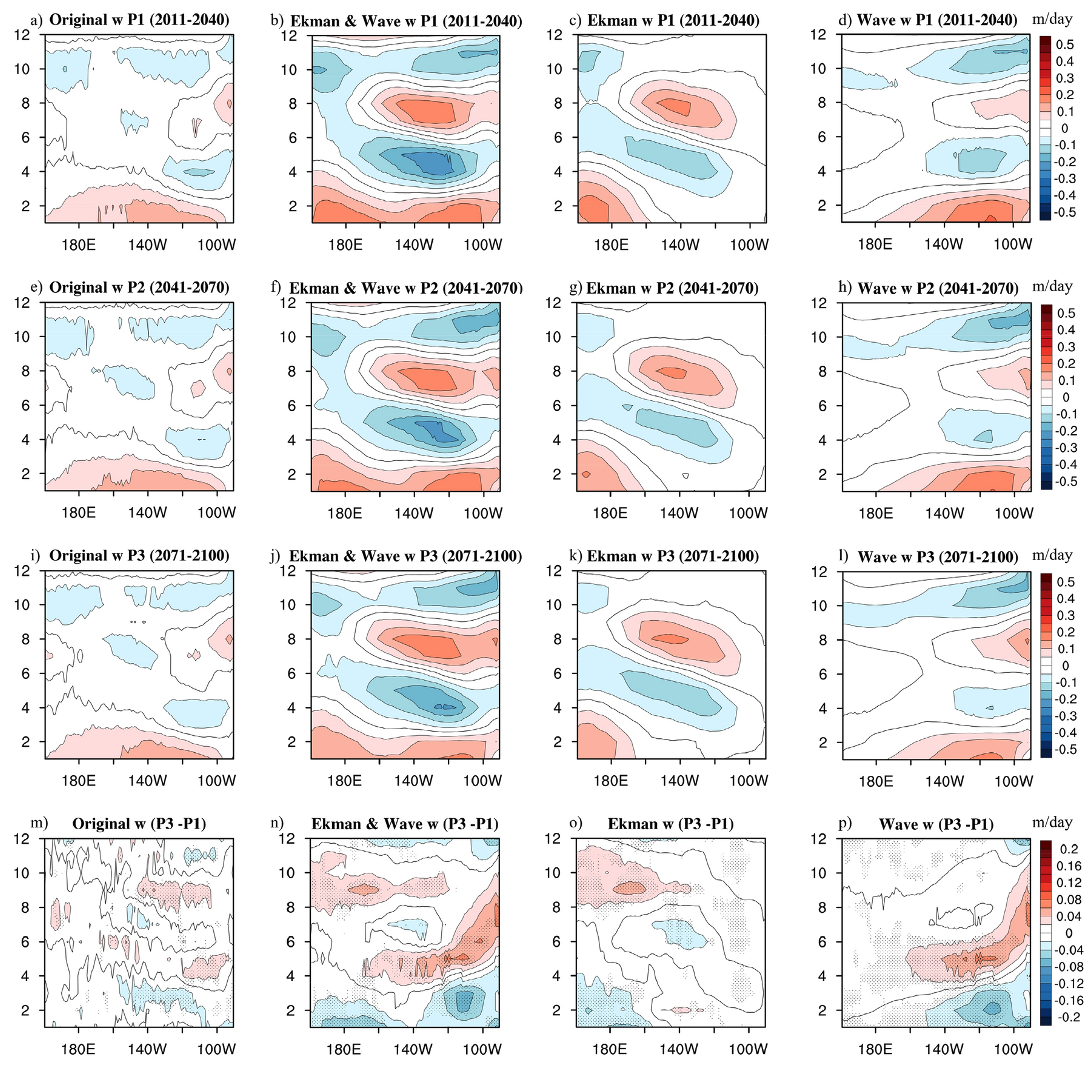 圖二、赤道太平洋湧升流的年循環於19個CMIP5模式的系集平均下,其原始輸出值、理論模擬值、艾克曼效應與波效應在(a–d)P1期間、(e–h)P2期間、(i–l)P3期間,和(m–p)P3與P1期間的差異(單位:公尺/天)。P1–P3分別為2011–2040年、2041–2070年和2071–2100年三個時間區間。黑點代表超過70%模式的模擬結果與CMIP5模式的系集平均吻合。