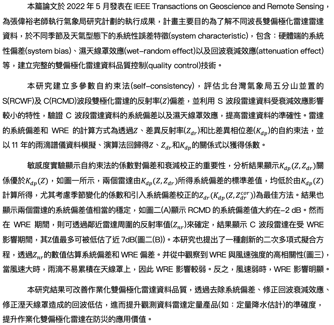 Loh, J. L., Chang, W.-Y., Hsu, H.-W., Lin, P.-F., Chang, P.-L., Teng, Y.-L., & Liou, Y.-C., "Long-Term Assessment of the Reflectivity Biases and Wet-Radome Effect Using Collocated Operational S- and C-Band Dual-Polarization Radars," in IEEE Transactions on Geoscience and Remote Sensing, vol. 60, pp. 1-17, 2022, Art no. 5113217, https://doi.org/10.1109/TGRS.2022.3170609.