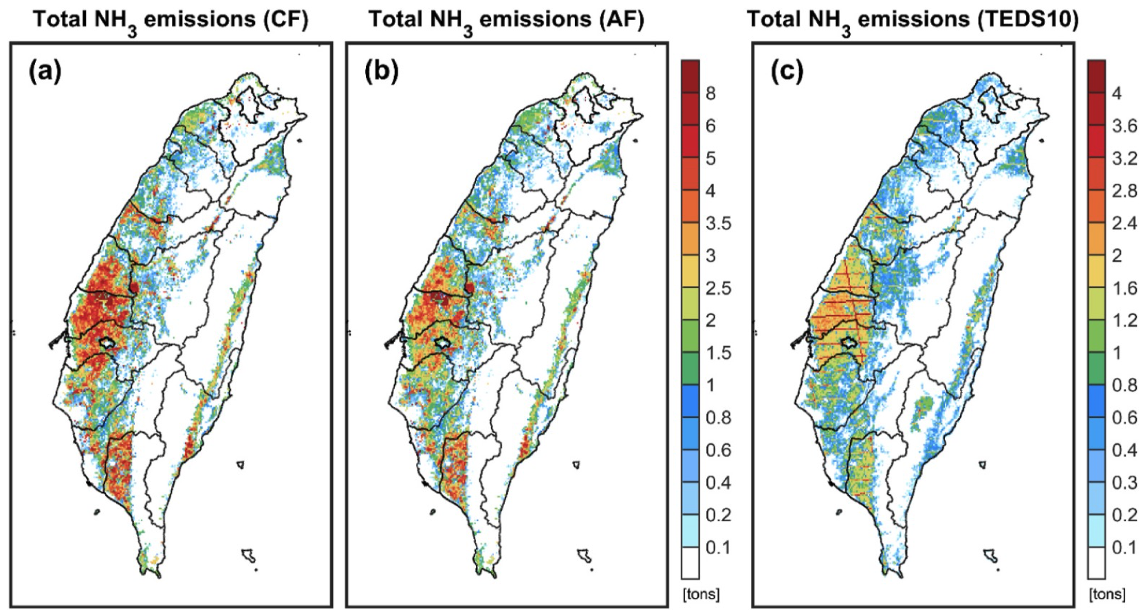 圖一: 台灣農業施肥氨氣年排放量空間分佈。(a)慣行農法情境,(b)合理化施肥情境,(c)環保署官方