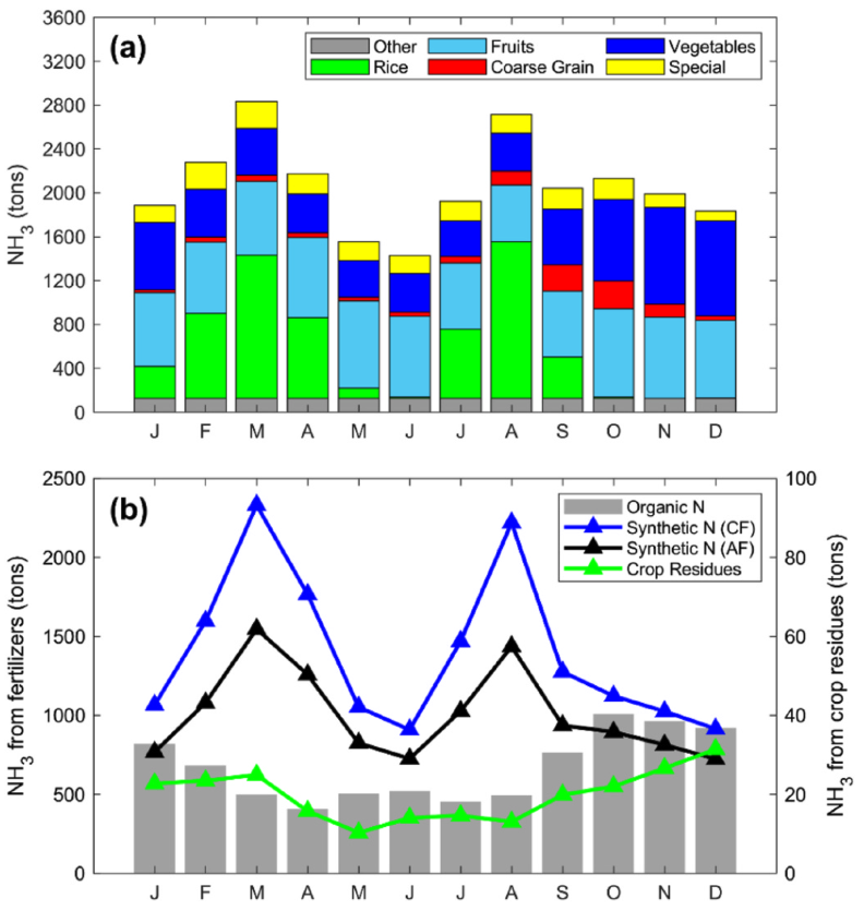 圖二: (a)六大農作物氨氣排放量月變化,(b)化學肥料,有機質肥料和作物殘體氨氣排放量月變化。