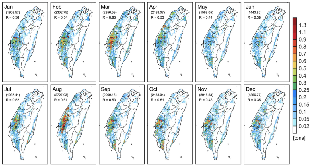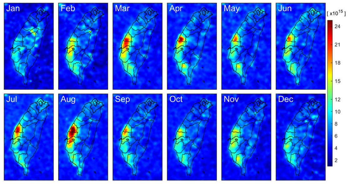 八月水稻種植期相關性高,可以推測臺灣的氨氣時空季節變化主要受到農業施肥活動主導(圖三、四)。
