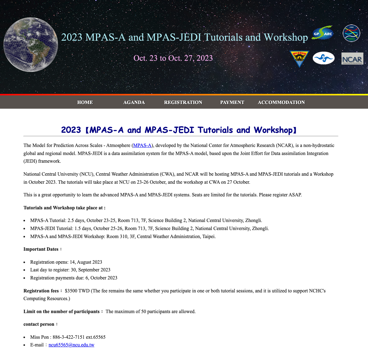 National Central University (NCU), Central Weather Administration (CWA), and NCAR will be hosting MPAS-A and MPAS-JEDI tutorials and a Workshop in October 2023. The tutorials will take place at NCU on 23-26 October, and the workshop at CWA on 27 October.