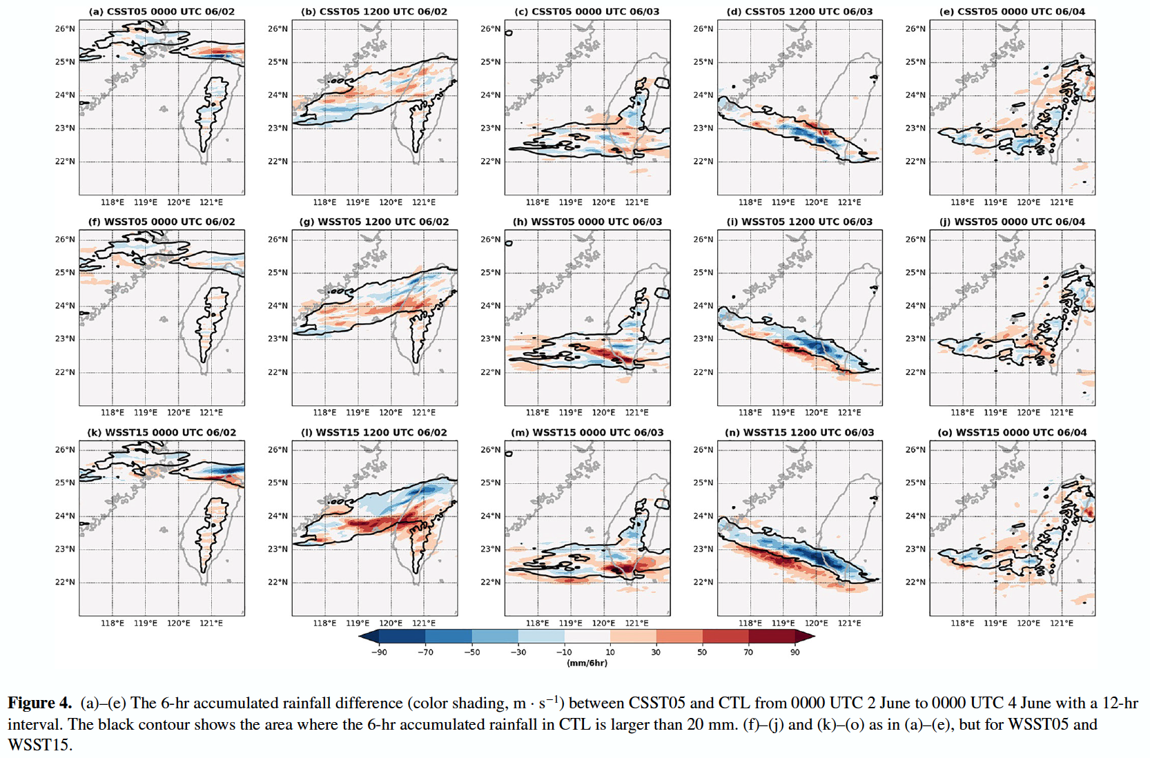 在本研究中探討南海的海表溫度變化如何透過影響海洋邊界層噴流的動熱力結構,進而影響臺灣梅雨季期間發生的極端降雨事件。研究結果顯示,南海海表溫度上升會使得梅雨鋒面雨帶南移,對臺灣的降雨有顯著的影響。雨帶的南移是因為往臺灣的水氣輸送增加導致鋒面前緣降雨增加,以及海洋邊界層噴流減弱使得梅雨鋒面可以移動到更南邊的位置,以上兩個因素共同造成。當海溫下降時則有相反的影響,但在此個案中影響較小。此研究結果顯示對海洋狀態的正確估計將有助於數值天氣預報模式提升極端降雨事件的預報表現。