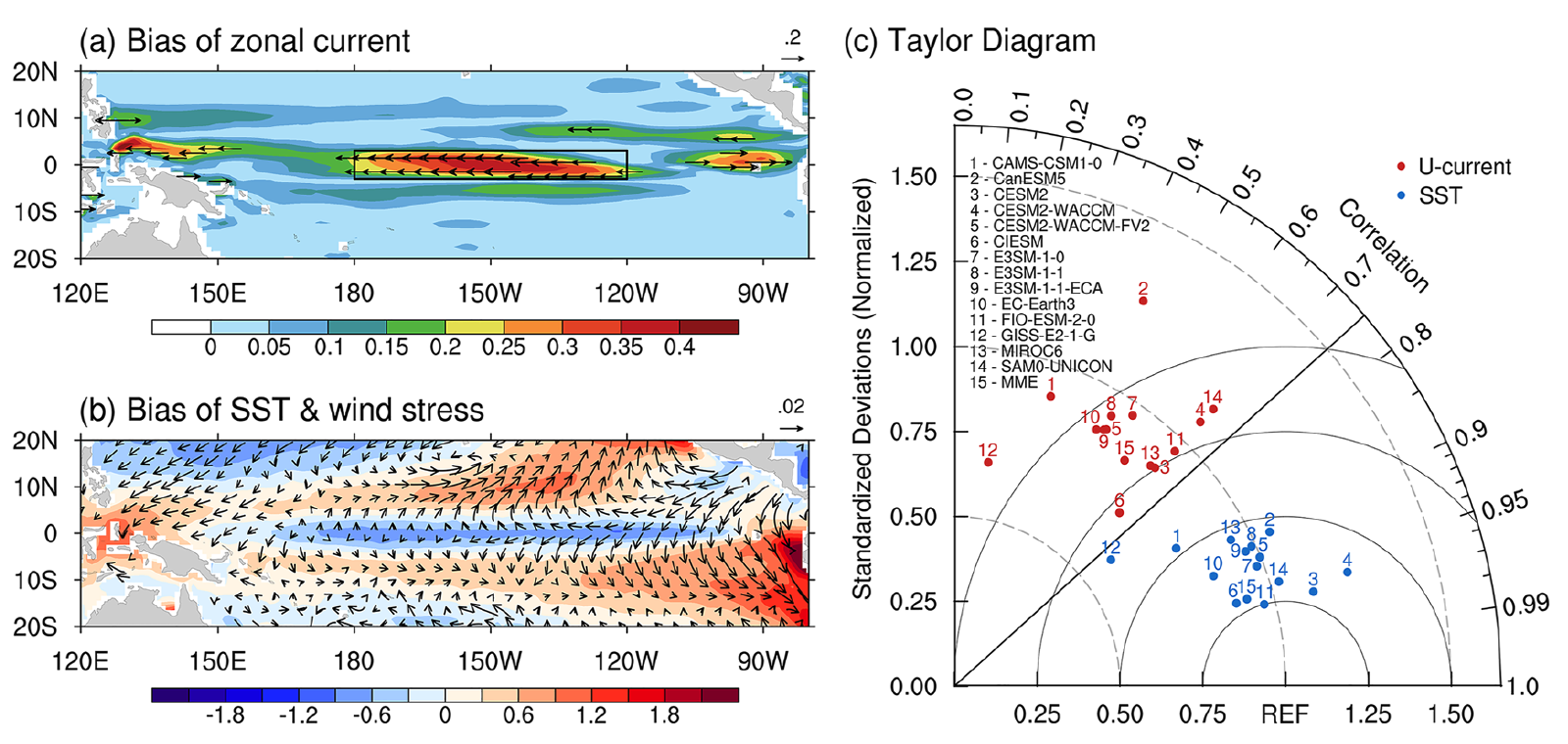圖一、(a) CMIP6多模式集合(multi-model ensemble, MME)中,平均50公尺深度內的緯向流(m/s)平均態偏差。底色和向量 (只顯示大於參考幅度的部分)分別表示強度和速度。黑色矩形表示極端偏差區域(3°S–3°N,180°–120°W)。(b) 在CMIP6 MME中,海表溫度(sea surface temperature, SST)的平均狀態偏差(底色:°C),並附有風應力(向量:Nm^−2)場。(c)在20°S–20°N,120°E–80°W範圍內,CMIP6模擬的平均態SST(藍點)和緯向洋流(紅點)的泰勒圖,與觀測進行比較。右上方的弧形軸表示模式相關係數。黑色對角線表示0.75的模式相關係數,突顯了模擬中SST和緯向洋流之間的顯著差異。與x和y坐標相對應的灰色虛線弧表示模擬和觀測結構之間標準差的比率。x軸上的“REF”表示從觀測中得出的參考點,黑色實線弧顯示了基於參考點的均方根差異。