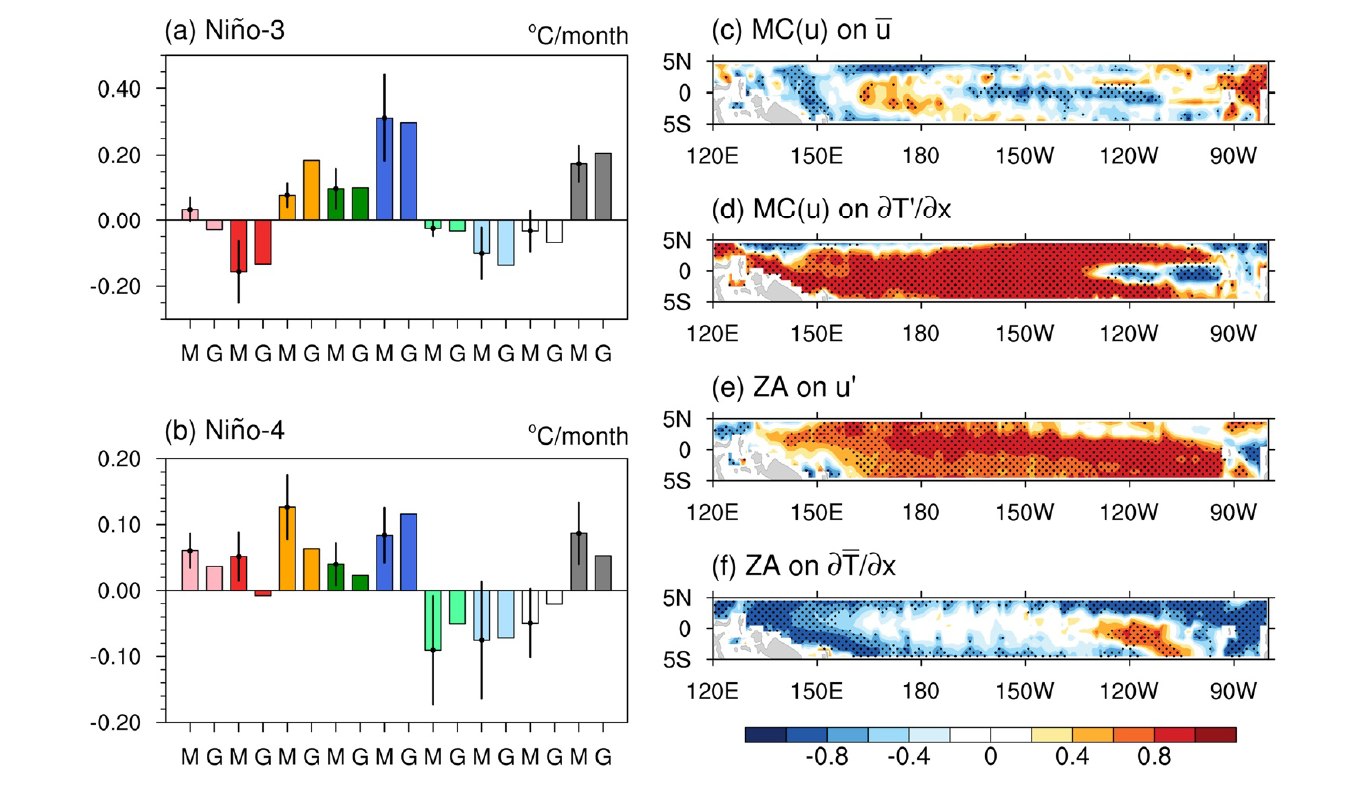 圖一、(a) El Niño發展階段在Niño-3區域的熱量收支項(°Cmonth−1)的合成。直方圖顯示了平均緯向洋流效應[MC(u)](粉色)、平均洋流效應(紅色)、緯向平流回饋(橙色)、艾克曼回饋(深綠色)、斜溫層回饋(深藍色)、非線性動力加熱(淺綠色)、熱力阻尼(淺藍色)、殘餘項(白色)和斜溫層溫度異常趨勢(灰色)的幅度。(b)與(a)相同,但針對Niño-4區域。直方圖上的黑線表示模擬合成的標準差範圍,提供了對CMIP6模型差異的評估。字母“M”和“G”表示這些值分別來自CMIP6 MME和GODAS。(c)在赤道太平洋,MC(u)對平均緯向洋流(u̅)模式間的迴歸,異常值的計算基於El Niño發展階段的合成。在計算回歸係數之前,變數皆經過標準化。黑點顯示回歸係數達95%信心水準。(d–f) 與(c)相同,但為MC(u)對∂T’/∂x,以及緯向平流項分別對u’以及對∂T̅/∂x模式間的迴歸。