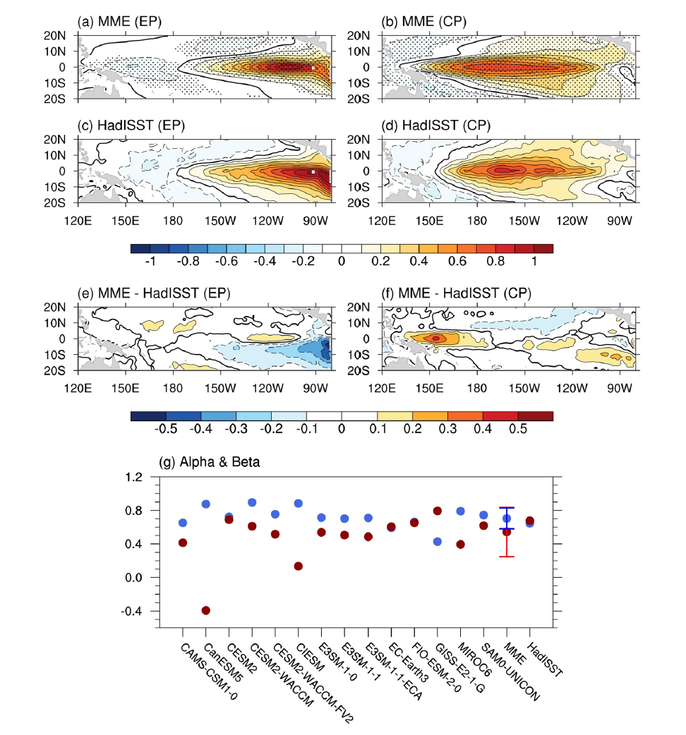 圖二、經由CMIP6 MME進行的迴歸–經驗正交函數(empirical orthogonal function, EOF)分析得出SSTA變異的EOF1模式,分別針對(a) EP El Niño和(b) CP El Niño。(c, d) 與(a, b)相同,但針對HadISST海溫資料。(e)為(c, a)的差異。(f)為(d, b)的差異。黑點顯示超過70%的模式呈現相同的符號。(g)從Supporting Information中的公式S1中計算得出的14個CMIP6模式、MME和HadISST的線性迴歸係數α(紅點)和β(藍點)。係數α和β分別表示EP El Niño和CP El Niño的迴歸係數。紅色和藍色直條表示模擬合成的標準差範圍,提供了對CMIP6模式差異的評估。
