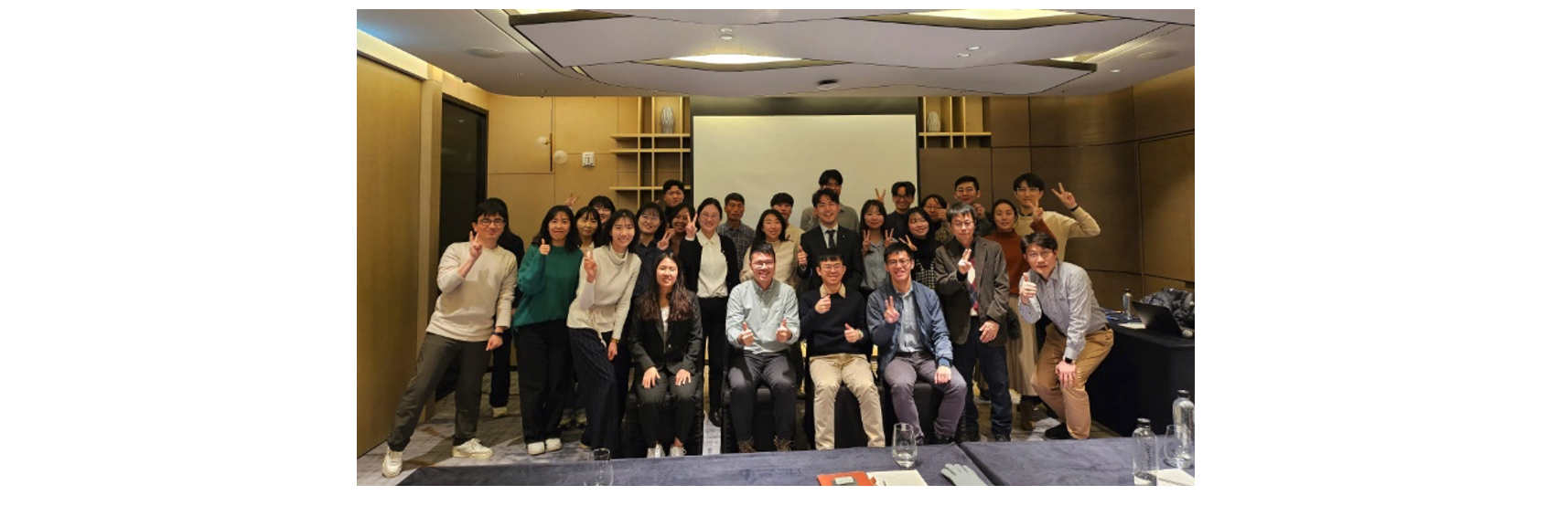 圖一、2024年12月18日在首爾費爾蒙大使酒店參加 2024年海外氣象雷達專家研討會暨諮詢會議,與會者包含WRC人員、奧克拉荷馬大學學者李博士(前排左1)、本系雷達氣象實驗室研究助理張沁全 (左2)、林華恩 (左3)、鄧詠霖 (左4)與負責接待臺灣代表的李承雨博士(右2)。