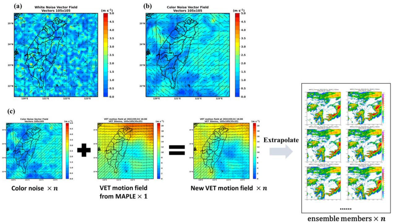 (c) 將擾動加入天氣系統流場,產生系集即時預報系統。