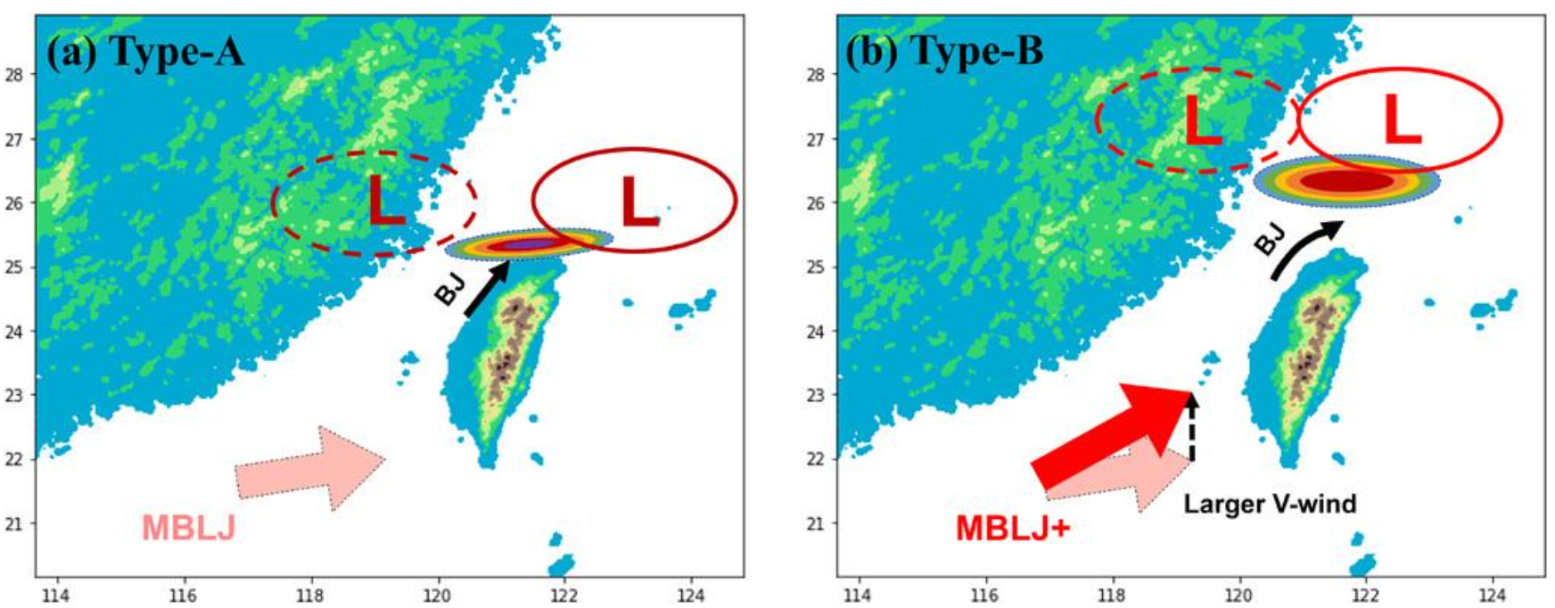 (b)B型: 豪雨集中在台灣北部海域外,鋒面氣旋形成於離北部較遠的地方。圖中紅色箭頭代表較強的南向 MBLJ(MBLJ+),其南向成分較一般 MBLJ 更為明顯;同時,BJ 延伸得更北,達到豪雨區域的南緣。