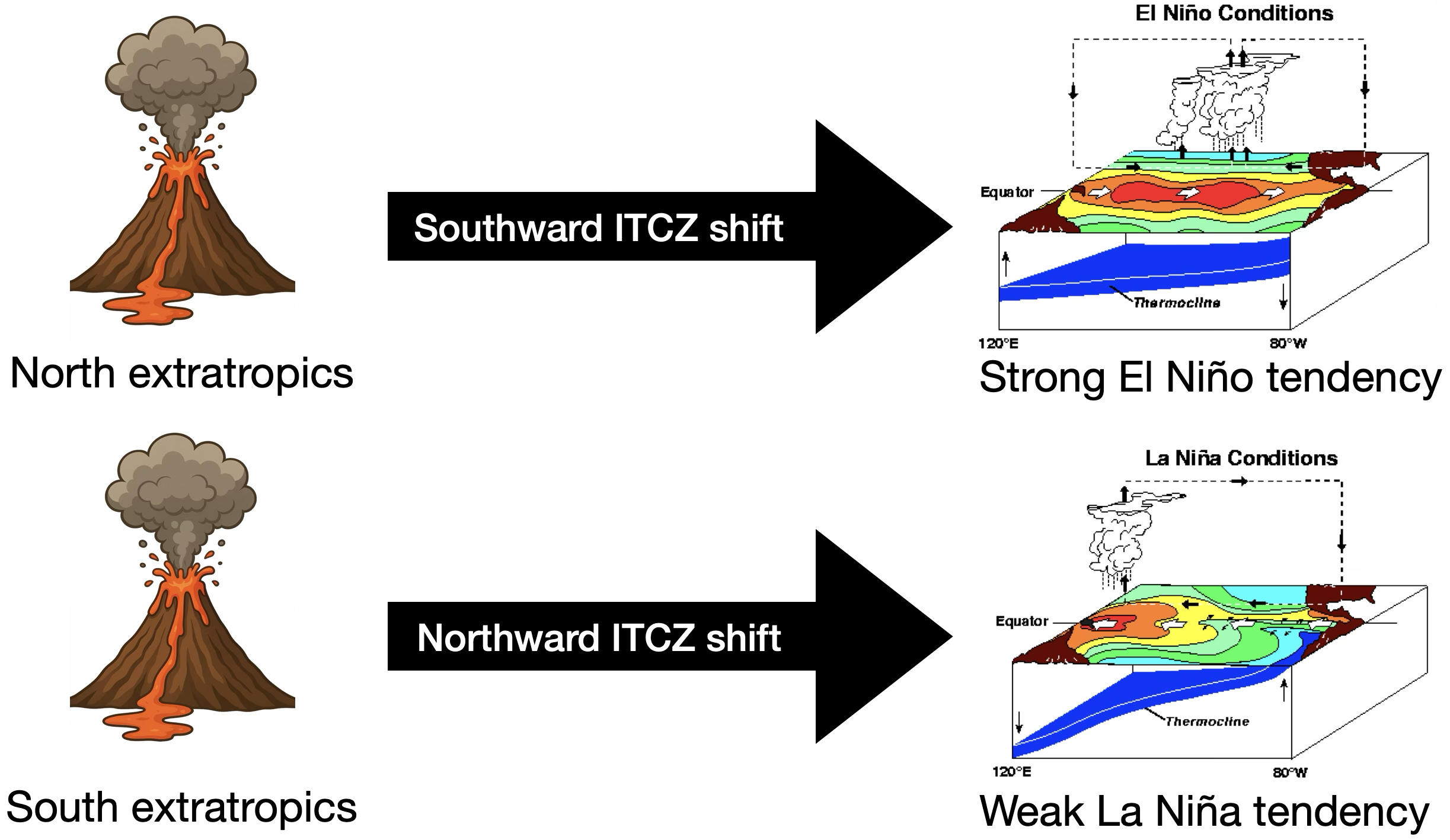 其中一個正在做的題目是『不同類型的火山爆發對聖嬰現象的影響』。我發現北半球的火山爆發會造成赤道降雨的南移,也就是熱帶輻合帶的南移,進而更容易產生強度大的聖嬰現象,另一方面,南半球的火山會造成將與北移,但只會造成較弱的反聖嬰現象(Fig.1)。另一個題目是『90萬年前的劇烈氣候變化對古人類DNA的影響』。我發現90萬年前的中更新世氣候轉變造成氣溫驟降並降低食物來源,使得匠人的生存變得不易,古人類的DNA多樣性大幅減少。很高興能夠能夠加入中央大氣,希望之後能在這邊做出更多更好的研究。