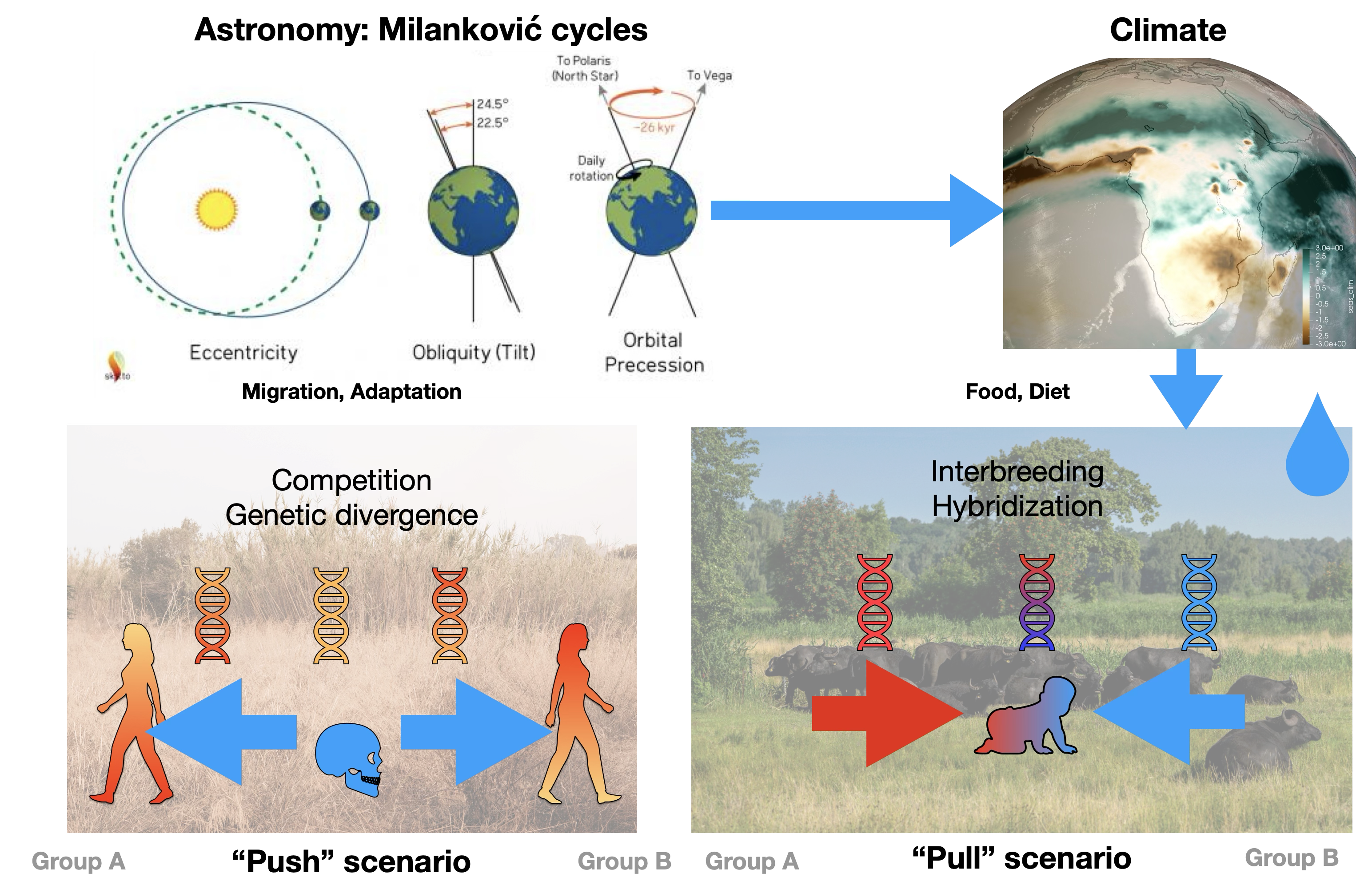 Specifically, one current research is on volcanic impacts on ENSO dynamics (Fig. 1), which investigates how volcanic eruptions from different locations and amplitude can displace the tropical precipitation, or the Intertropical Convergence Zone, and further influence the probability of the existence of distinct ENSO types. Another research topics is to understand how past climate changes may alter the DNA diversity of our ancestors, Homo lineages, through the changes in food availability and their habitat feasibility (Fig. 2). With these diverse interests, I am looking forward to work on more exciting and more essential research in NCU-AS.
