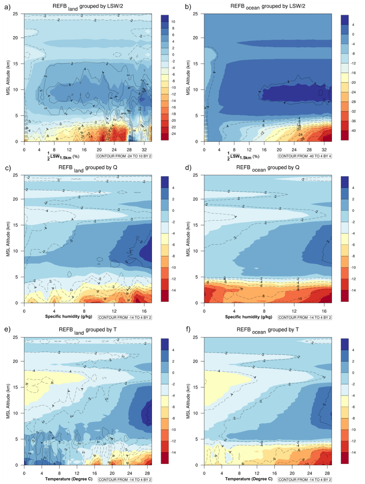 Figure 1: Refractivity bias as a function of height and average values over the lowest 1.5 km above MSL of (a) LSW/2, (c) specific humidity and (e) temperature over land. (b), (d) and (f) are the same as (a), (c) and (e), except over the ocean. The color shading shows the result using the RO profiles penetrating below 1.5 km while the contour uses the RO profiles penetrating below 0.5 km.