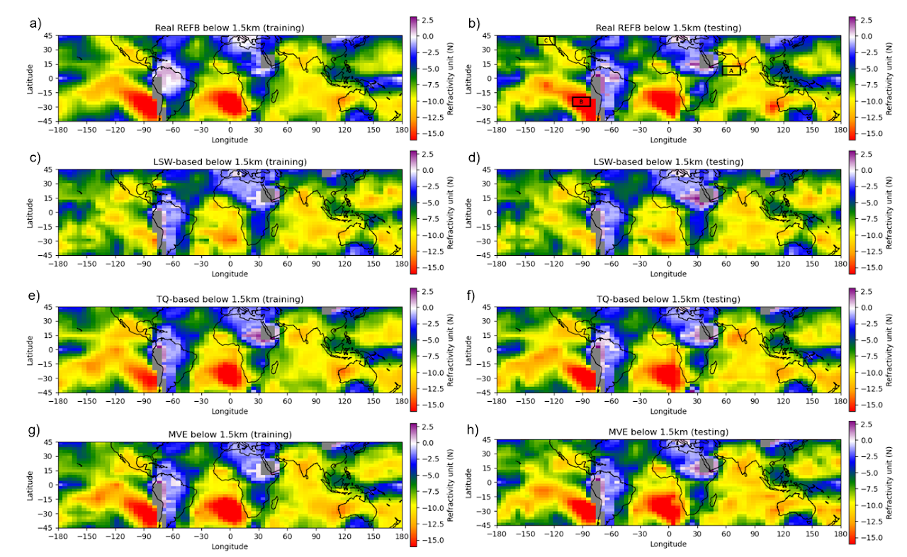 Figure 2: Horizontal distribution of refractivity bias and different estimated refractivity biases. All variables used to construct this figure are averaged below 1.5km. Area A is in the region of 0° < Lat < 10°N and 55°E < Lon <75°E, Area B is in the region of 20°S < Lat < 30°S and 105°W < Lon < 85°W, and Area C is in the region of 35°S < Lat < 45°S and 120°W < Lon < 135°W.