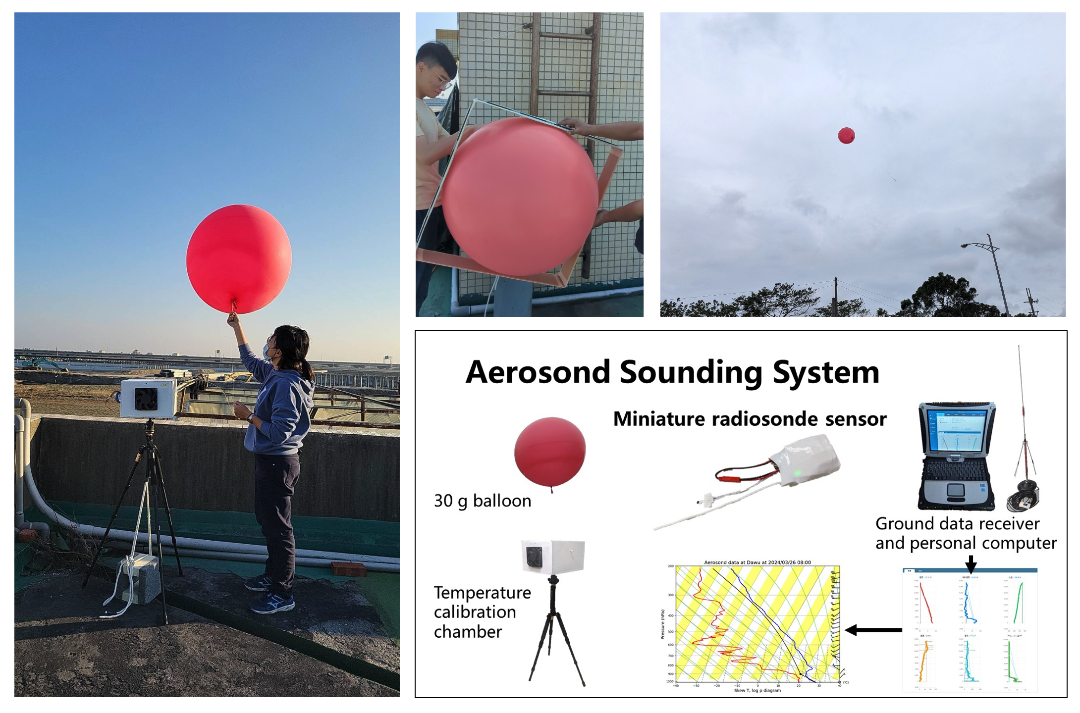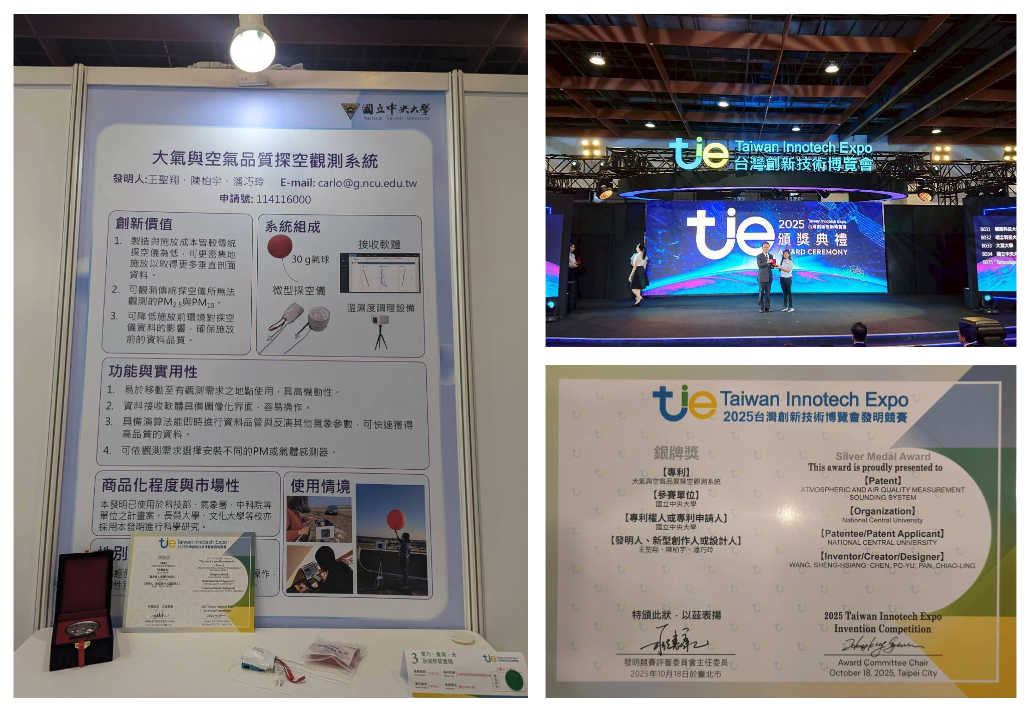 王聖翔老師領導之團隊,自2019年開始開發適用於邊界層觀測的微型探空系統。此系統的探空儀製造與施放成本較傳統探空儀為低,可滿足密集施放以取得較高時間解析度剖面資料的需求;另可量測PM2.5濃度,解析低層空氣污染物之垂直分布結構。此系統今年2025年送出專利申請,並於台灣發明年度盛會「2025台灣創新技術博覽會」中,在「電力、量測、光及儲存裝置類」領域獲得銀牌獎的殊榮。